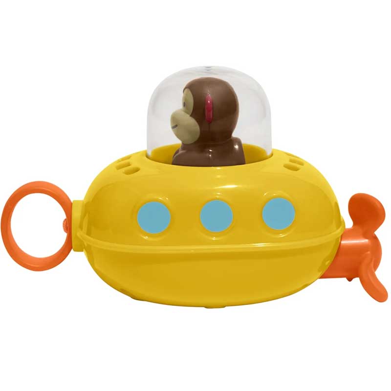 Denna badleksak är från cirka tolv månaders ålder och är en rolig badleksak i form av en liten apa som sitter i en ubåt. Den utmanar barnet och lär dem om orsak och verkan, vad händer egentligen när jag drar i snöret? Propellern startar och båten åker iväg under vattnets yta. Det här är en rolig leksak för badkaret som barnet kommer att ha mycket glädje utav.