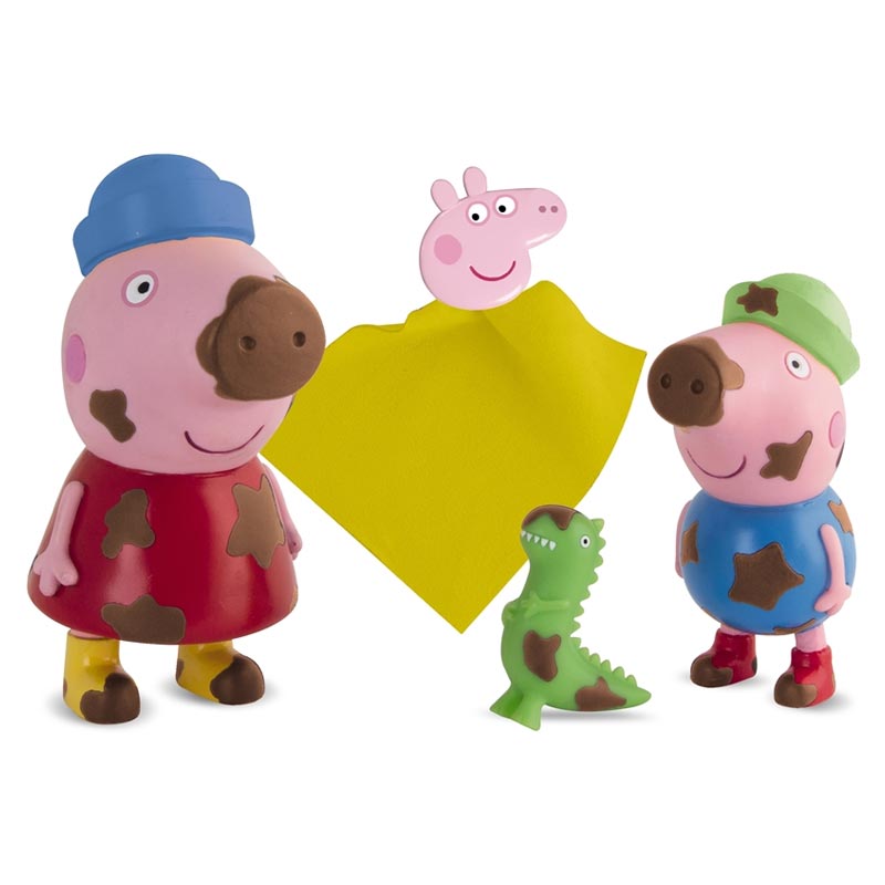 Greta Gris och Georg älskar att vara ute och plaska i lerpölar – men då måste man bada efteråt. De här badleksakerna föreställer Greta, Georg och Georgs gosedjursdinosaurie täckta av lerfläckar från topp till tå alla tre. När badleksakerna tvättas med den medföljande lilla handduken i varmt vatten försvinner de leriga fläckarna på ett magiskt sätt, och Greta Gris och lillebror blir rena och fina igen. Badleksakerna passar till barn som är 18 månader eller äldre, och är man på riktigt bushumör kan de också användas som små roliga vattensprutor.