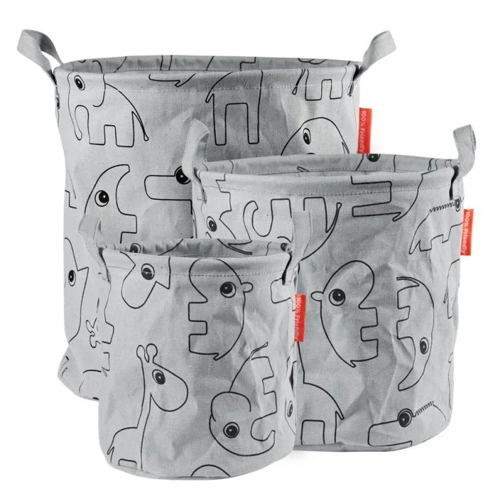 Dessa fina förvaringskorgarna i bomulls- och polyestertyg som säljs i 3-pack. Den större korgen är 33 cm hög, den mellanstora är 26 cm och den minsta cirka 20 cm. I dessa slänger du snabbt och smidigt ner leksakerna och sedan kan du enkelt ställa undan dem med hjälp av de påsydda handtagen. Korgarna har de olika djuren som numer förknippas med Done by Deer. Finns i grått och rosa.