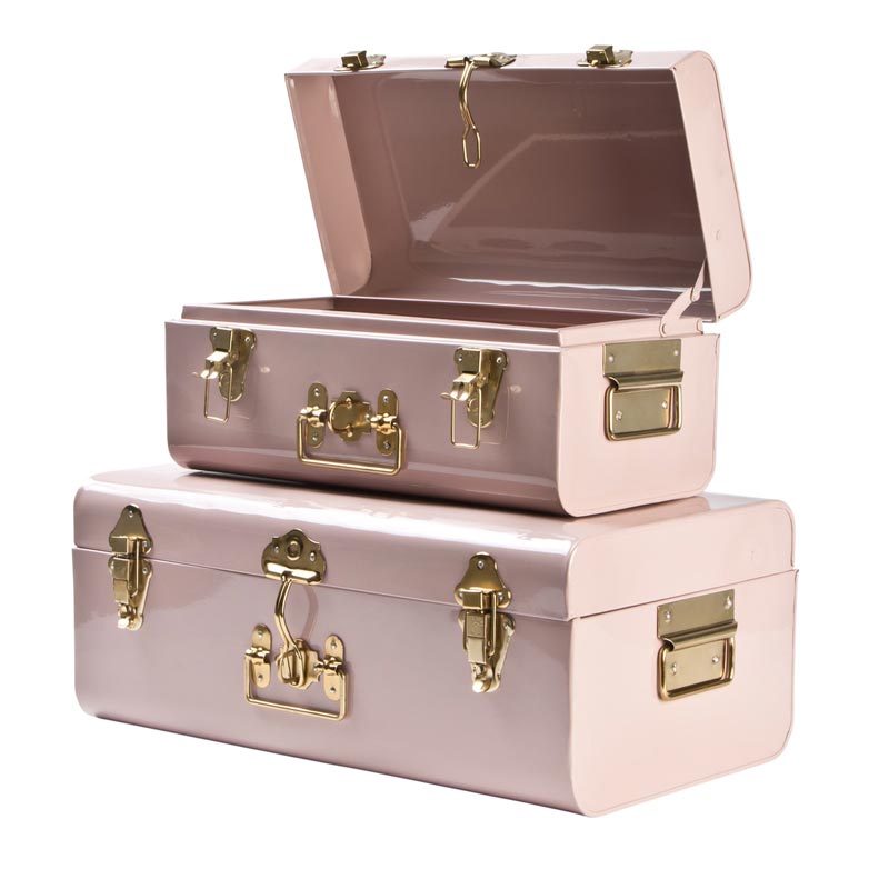 Dessa metallkoffertar från Jox rekommenderas varmt till alla som vill sätta lite lyxig känsla på förvaringen i barnrummet. De glansiga metallväskorna är tillverkade i en vacker ljusrosa nyans, och har snygga beslag och handtag i guldfärg. Du får dessutom mycket förvaring för pengarna med det här setet. Den stora kofferten är 47 x 27 x 19 cm, och den mindre 37.5 x 17 x 20 cm. Väskorna gör sig mycket bra på en hylla, eller staplade direkt på golvet. Om du vill frigöra lite plats eller tillfälligt lägga undan koffertarna går det även att förvara den mindre väskan i den större. Det här setet är CE-certifierat, säkerhetstestad och avsedd för barn från tre år.