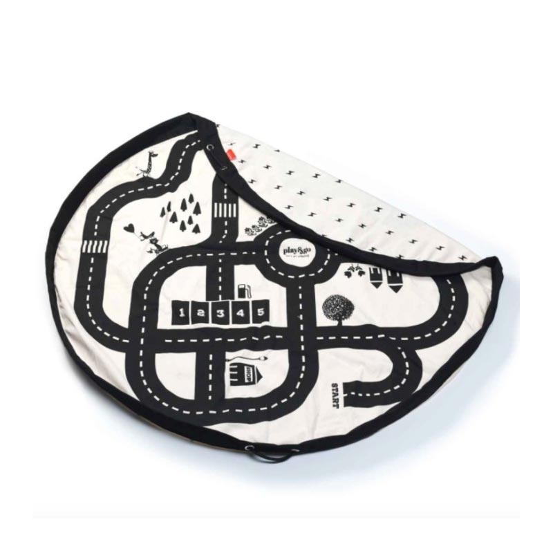 Personerna bakom den här produkten har verkligen tänkt till. Lekmattan från Play & Go är något mindre, 140 cm i diameter, men designad utifrån samma princip, att det ska vara enkelt att städa undan efter lekstunden. Den samlas enkelt ihop med hjälp av resårbandet, och alla leksaker förvaras smidigt i säcken fram till nästa tillfälle. Lekmattan blir dessutom en integrerad del av leken, eftersom mönstret består av en bilbana, komplett med rondell, övergångsställen och parkeringsplatser, som inspirerar barnen till trafikövningar. Den här produkten, som är producerad helt i bomull, fungerar med sitt dekorativa mönster även fint som permanent matta i barnrummet.